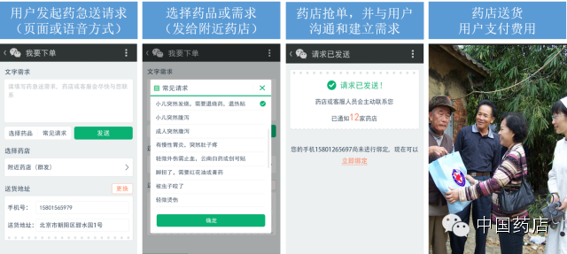 借助微信,好药师主要实现的能力和业务模式 1、B2C电商 好药师小店,提供了购物车,并整合了各类促销、优惠活动,支持用户的充值或使用折扣券。接入了微信支付,利用微信共享地址薄获取送货地址,利用微信模板消息实现订单付款成功和出库的消息告知。 2、电商统一管理及咨询服务 借助微信强大的通讯及管理能力,好药师将微信形成了一个统一的咨询服务及电商管理的平台。 无论在哪个平台上购买了商品,只要用户在好药师微信公众号中注册自己的手机号,均可在微信中查询订单的状况,或与好药师的在线执业药师,就使用、售后等问题,以语音、文字形式进行沟通和咨询。 同时,在用户购买药品后,针对一天用几次药、何时用,何时开停止疗程和再次开药给以了提醒和建议。 3、O2O服务 O2O业务,一直是微信区别于其他移动应用的巨大特色。而扫一扫就是打通O2O环节的重要入口。好药师借助扫一扫和微信公众平台的各个功能,推出了线上商城及线下药店打通的“药急送”业务。 药急送业务主要的形态,是用户通过微信,发出自己的疾病信息或购药需求,附近的药店通过抢单模式捕获用户需求并联系用户,确认订单后药店可实现30分钟的药“急送”,并支持用户用微信完成支付。